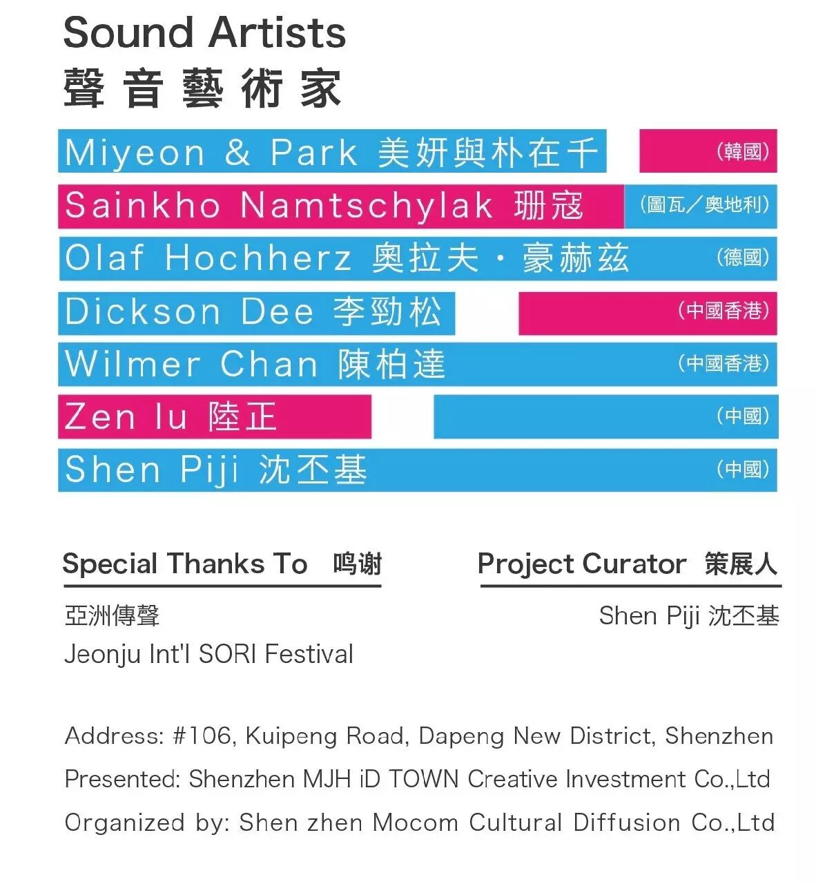 此次首届艺象声音艺术节,重点突出在艺术现场的实验性与即兴性,都是体现在艺术家们经验的现时表现力与感染力上,艺术区特别邀请了国内外八位声音艺术家的参与,著名的珊寇Sainkho(图瓦/奥地利)、著名的“美妍 & 朴” Miyeon & Park(韩国双人组)、著名的实验声音艺术家奥拉夫·豪赫兹Olaf Hochherz(德国)、世界实验声音圈最活跃的声音艺术家李劲松Dickson Dee(香港)、著名聲音藝術家陳伯達以及两位深圳本土的声音艺术家沈丕基、陆正Zen lu。在两天的艺术节中,既有各位艺术家独立的表演又有各种的即兴互动,以及24号晚19:30开始的集体,23号下午16:00,还将有一场别开生面的“Sainkho Namchylak Food Art”珊寇唱作展。